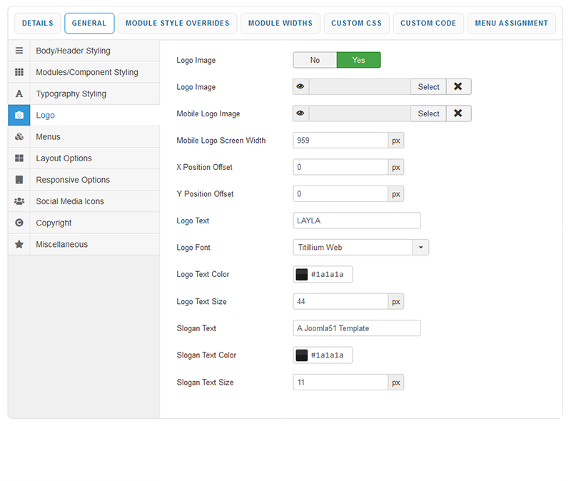 This section of the template parameters allows full control over your site logo with an array of easy to use options. Upload your logo image via the 'Select Logo Image' field and then use the X and Y axis field to tweak its position.